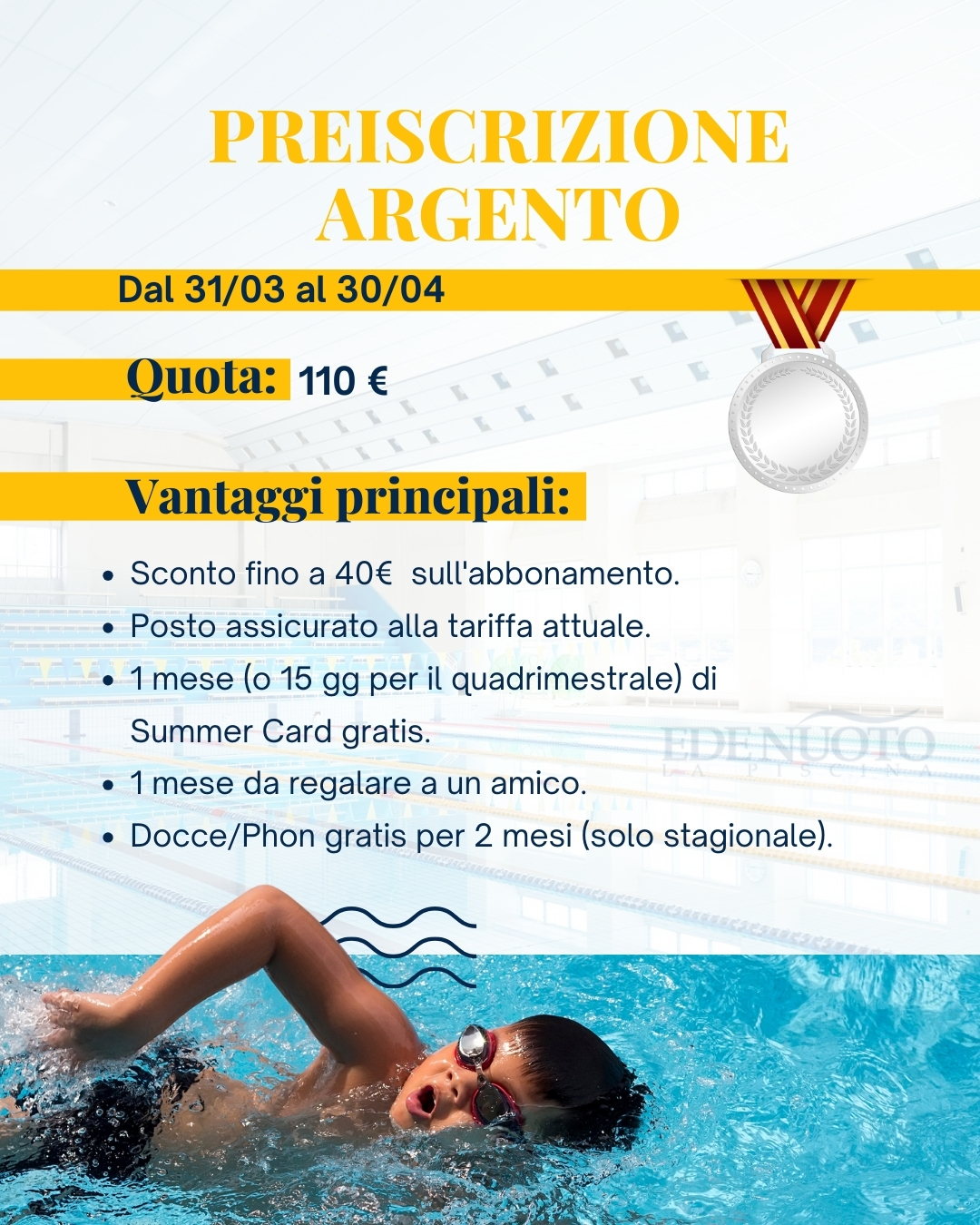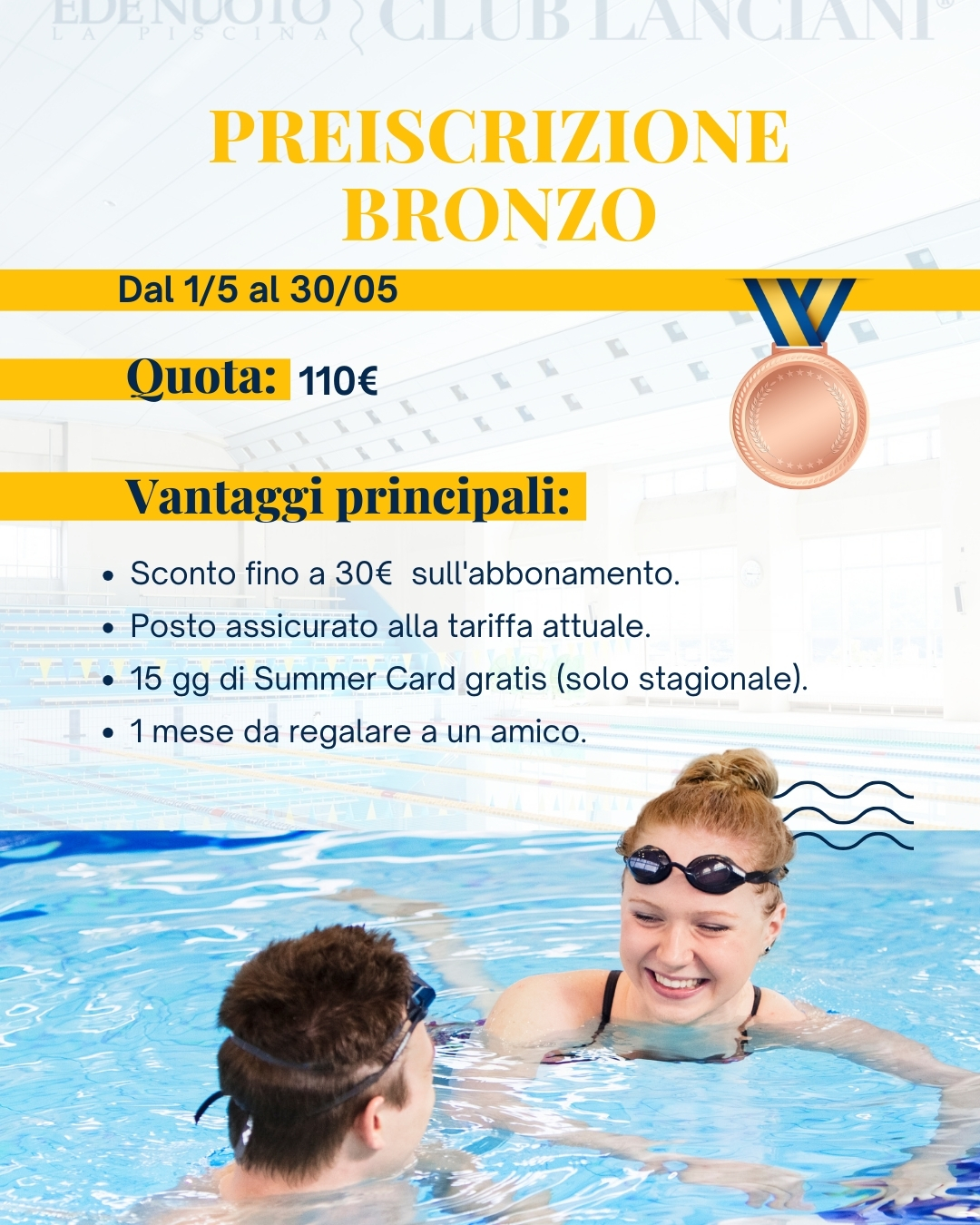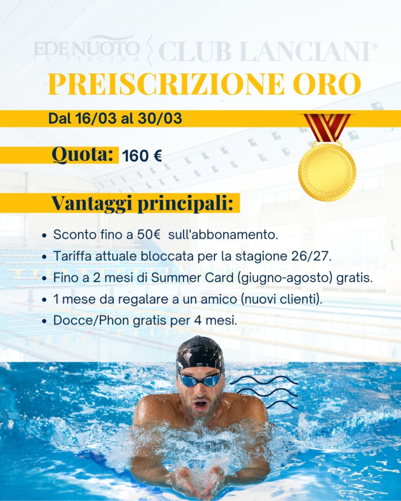 PREISCRIZIONE AI CORSI INVERNALI 26/27 Con un acconto sul tuo abbonamento, puoi assicurarti un’estate gratuita in piscina e molto altro ancora! Prima ti iscrivi, più vantaggi otterrai! Chiama subito il numero 06 4181401.
